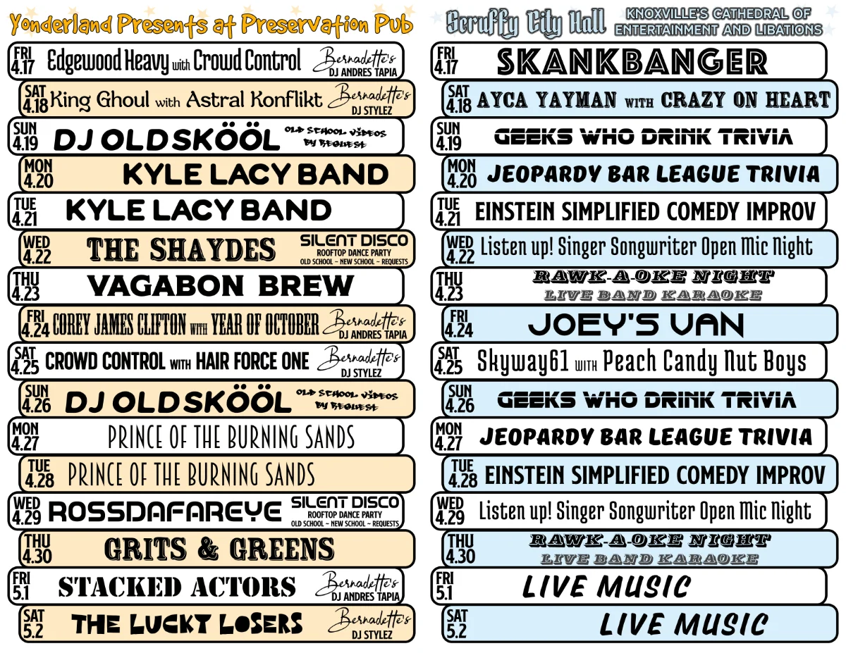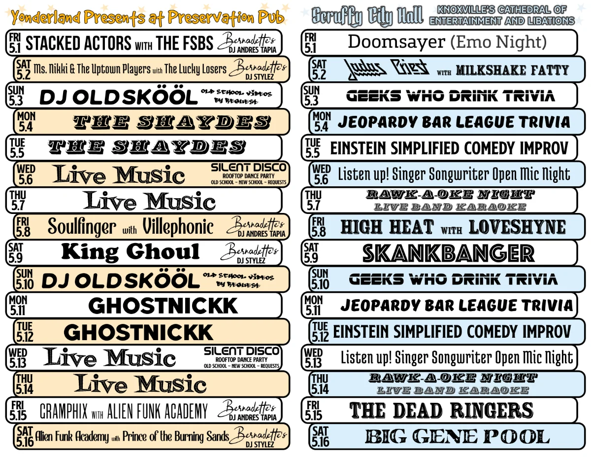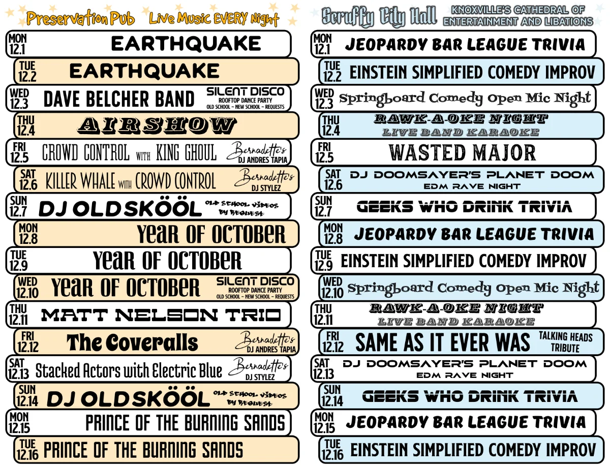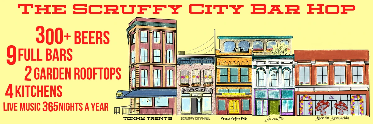 Owned by local rascals Bernadette and Scott West, who have played a big role in revitalizing both historic buildings and Market Square in downtown Scruffy City since 1990 (hence the name “Preservation” Pub), this local icon is open till 3 AM 365 days per year with live music nightly.