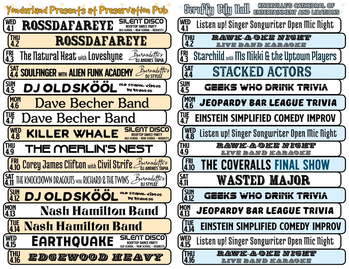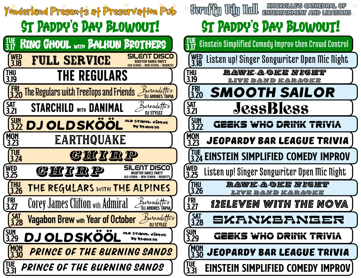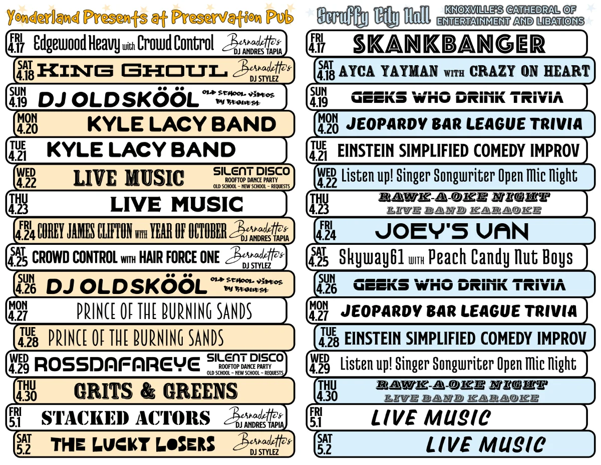 Owned by local rascals Bernadette and Scott West, who have played a big role in revitalizing both historic buildings and Market Square in downtown Scruffy City since 1990 (hence the name “Preservation” Pub), this local icon is open till 3 AM 365 days per year with live music nightly.